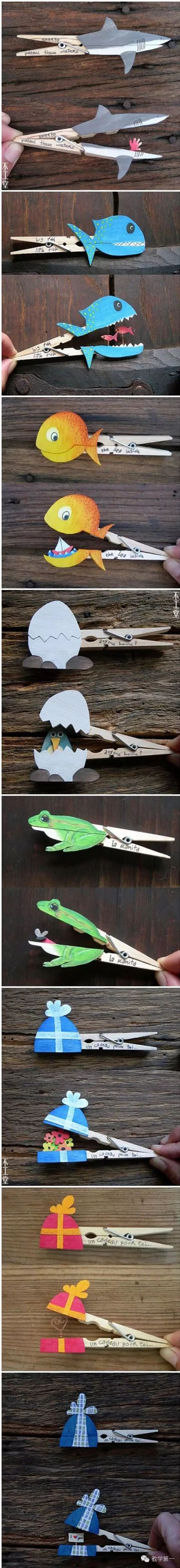 首页 » 亲子手工 » 正文 亲子手工 小小晾衣夹们也可以玩出很多花样哦 2015-06-17 放开你的想象力,小小晾衣夹们也可以玩出很多花样哦,它超强的被改造能力真是令人惊奇!看完下面的图,估计你再也按捺不住,想要动手的冲动了。孩子们,上超市!买夹子去!想继续查看更多有趣好玩的亲子游戏手工,记得关注我们哦! 标签:手工 · 晾衣夹 · 蝙蝠 · 鳄鱼