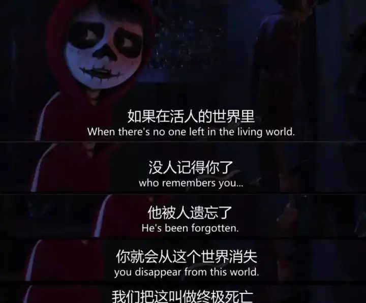 但是看过这部电影,我们对死亡,可能会变得不那么恐惧。因为它告诉我们——死亡不会让人从这个世界消失,当被爱着的人忘记时,那个人才算真正的死亡。